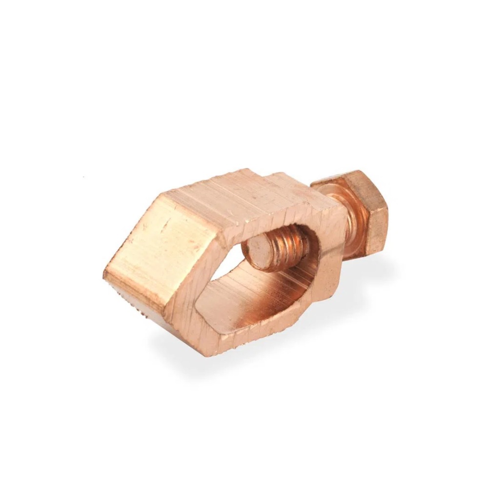 Conector de sistema de puesta a tierra para varilla Copperweld de 5/8″. Fabricado de aleación de cobre de alta resistencia mecánica, pernos en bronce o acero galvanizado. Rango de conductor: 8 – 1/0AWG. Tuerca M10.