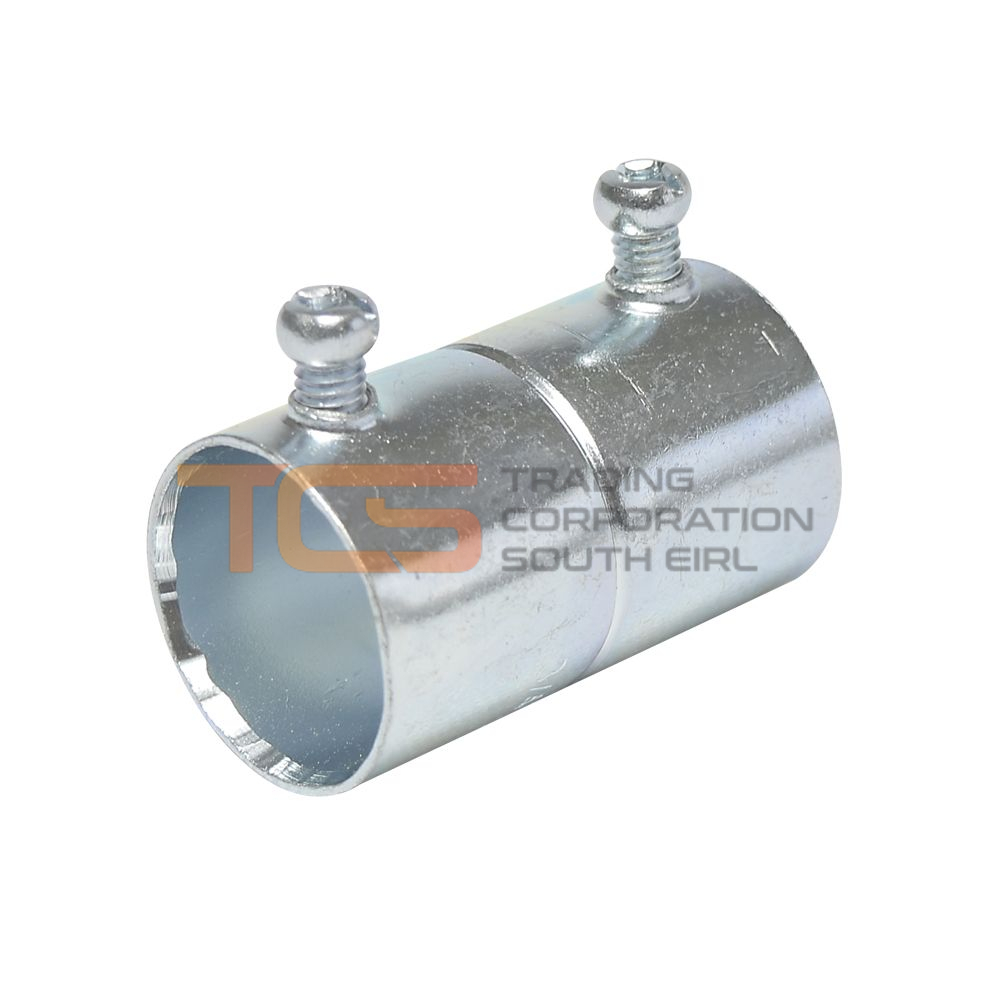 Unión Conduit de acero galvanizado. Se utilizan para unir dos tramos de tubo Conduit EMT a través de fijación a presión mediante tornillos. Certificación: UL.